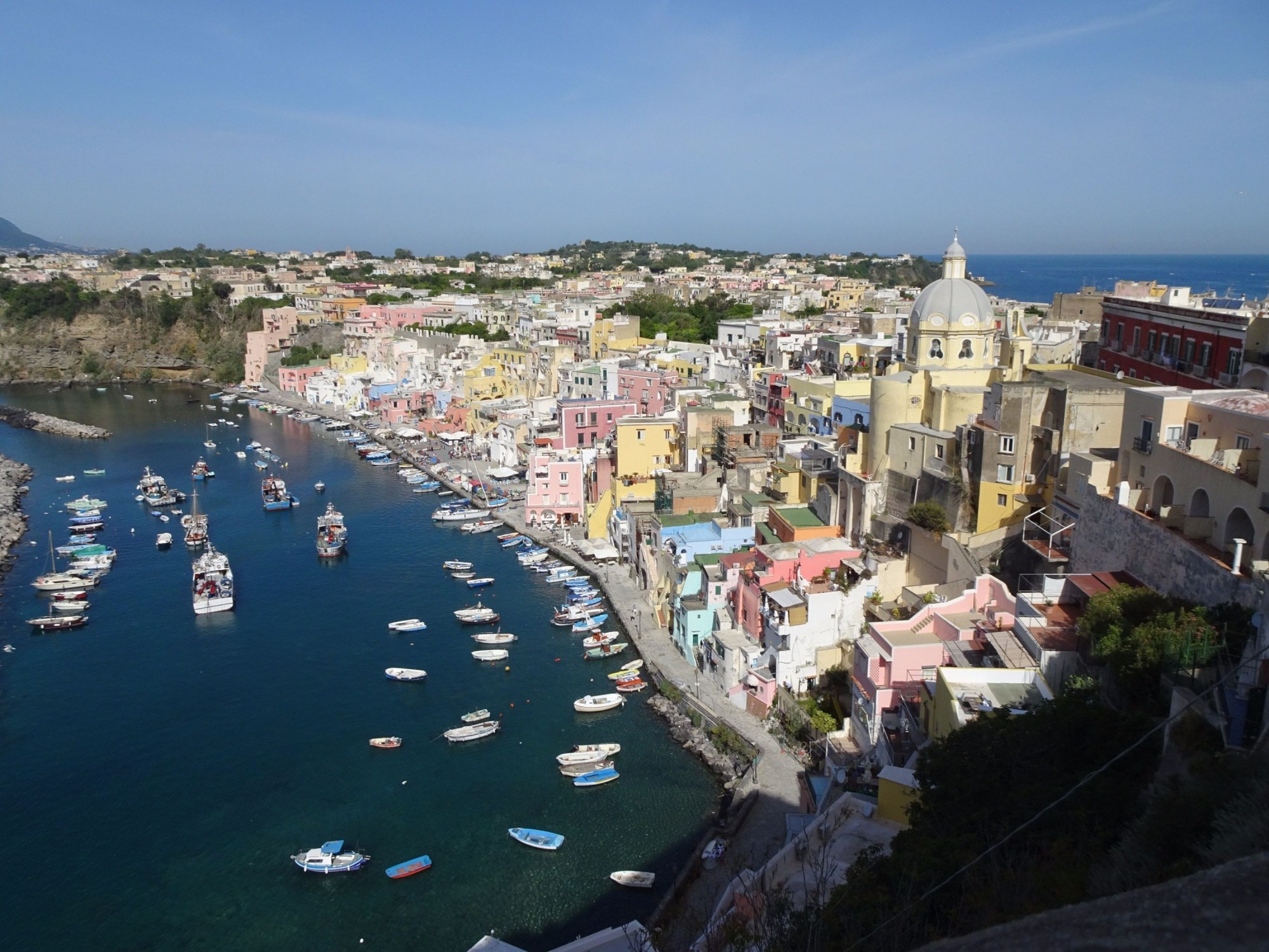 Procida is one of the 4 Phlegraean (Flegrean) islands which make up a small archipelago in the Phlegraean Fields – an area of ancient volcanic activity West of Naples and was formed from the eruptions of 4 extinct and submerged volcanoes. The other Phlegraen islands are Ischia, Vivara & Nisida (but not Capri which is from a geologically different origin). We travelled to Procida by high speed hydrofoil from Molo Beverello in Naples which takes under an hour – just long enough for a quick nap to sleep off the effects of our lunch in Capri!