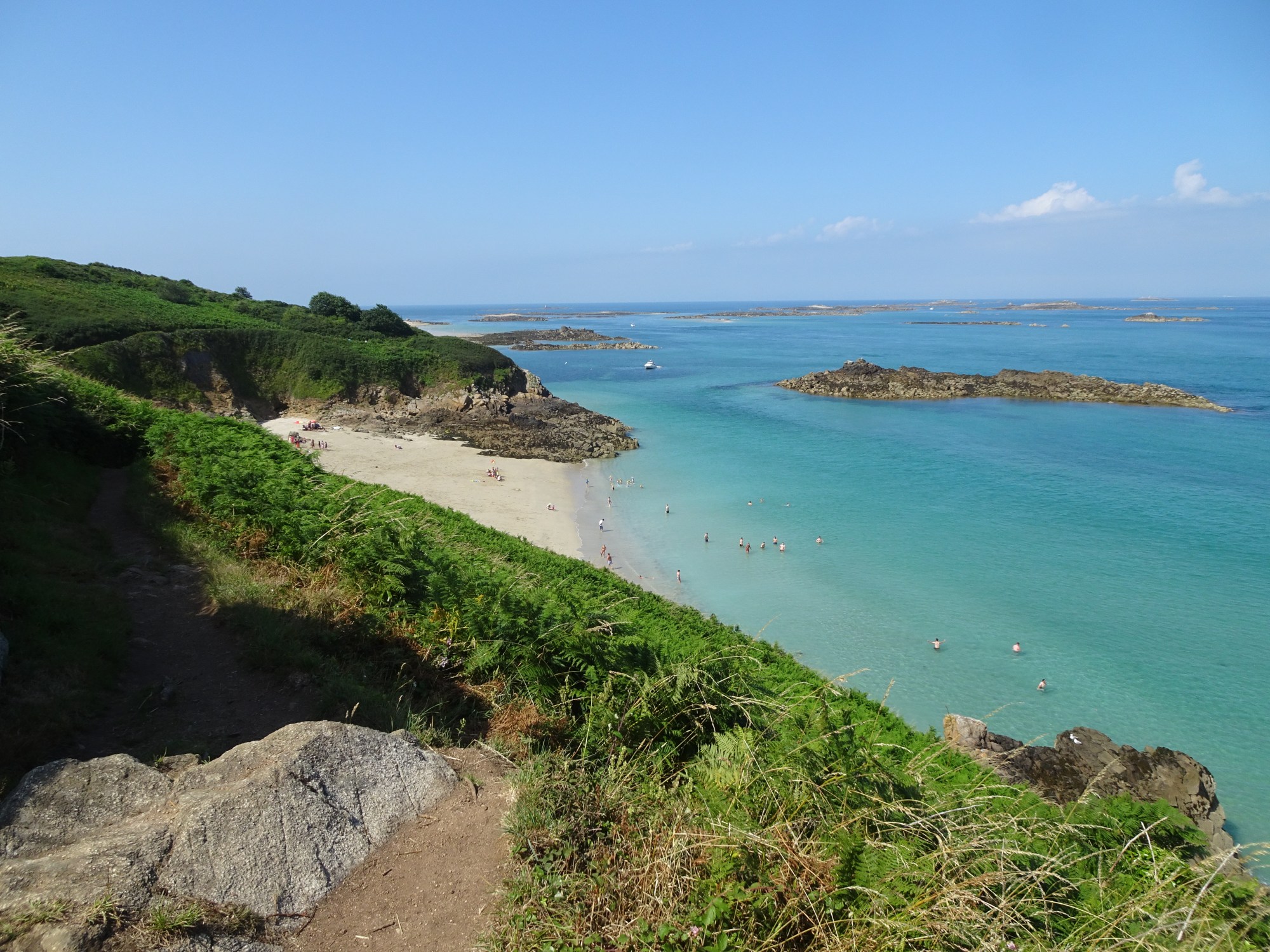 We walked around the whole island at a very leisurely pace in a clockwise direction from the Rosaire Steps, stopping to take lots of photos, to have a long paddle at shell beach and a well-deserved, chilled Guernsey cider at the Ship pub (attached to the White House Hotel) when we’d been all the way round. It’s an easy walk apart from the south part of the island where there are some steep ascents and descents and a few steps to negotiate. Large rocks have been conveniently positioned around the path to sit on a have a breather and admire the stunning views out to sea and to the other islands. The island is green and lush with carpets of wild flowers and moss to the east, thick bracken covering the west side and Holm oaks covering the southernmost part. The turquoise colour of the water is breathtaking and not what you would expect so close to home. It took us most of the day to wonder around but it was well worth the effort!